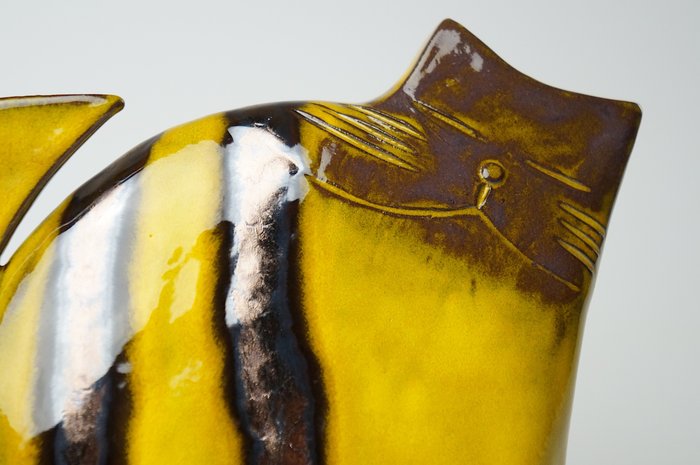 Met de hand gebeeldhouwd uit een donkere lichaam klei keramische kat is met de hand gemaakt en met de hand beschilderd met geel glazuur met geglazuurde gouden bronzen strepen. Stuk keramiek gesigneerd door de kunstenaar.