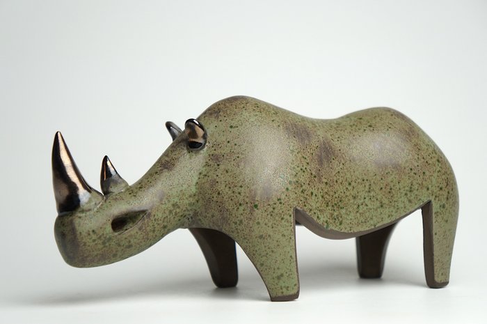 Met de hand gebeeldhouwd uit een donkere lichaamsklei keramische neushoorn is met de hand gemaakt en met de hand beschilderd met groen glazuur met geglazuurde goudbronzen elementen. Keramisch kunstwerk gesigneerd door de kunstenaar.