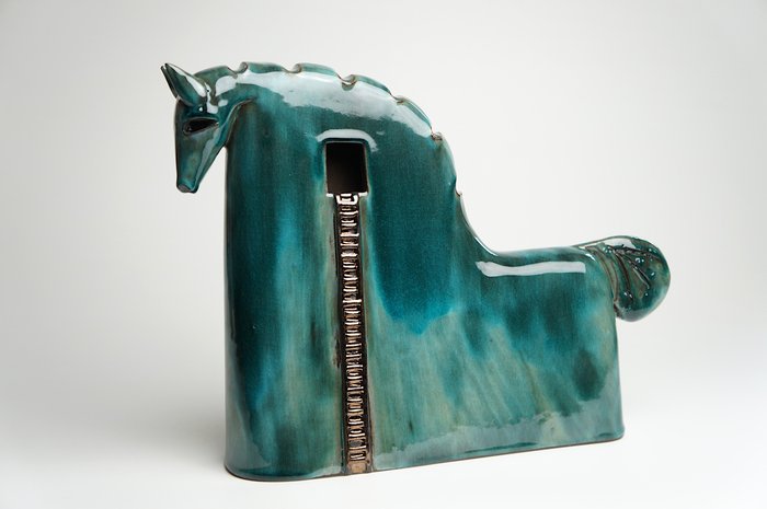 Met de hand gebeeldhouwd uit een keramisch paard met een donker lichaam, is met de hand gemaakt en met de hand beschilderd met turkoois glazuur met gouden bronzen elementen. Keramisch kunstwerk gesigneerd door de kunstenaar.