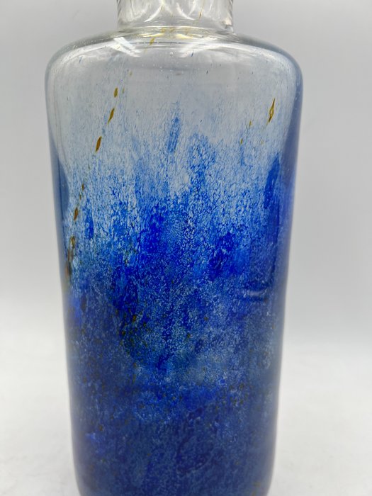 Schitterende Murano vaas, met blauwe kap en roesteffect details.