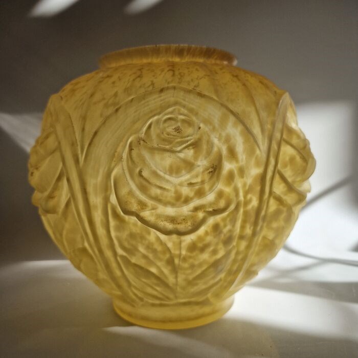 Grote Art Deco bolvaas, gedecoreerd met rozen in reliëf in gematteerd glas. Geel en wit gespikkeld. 1930.