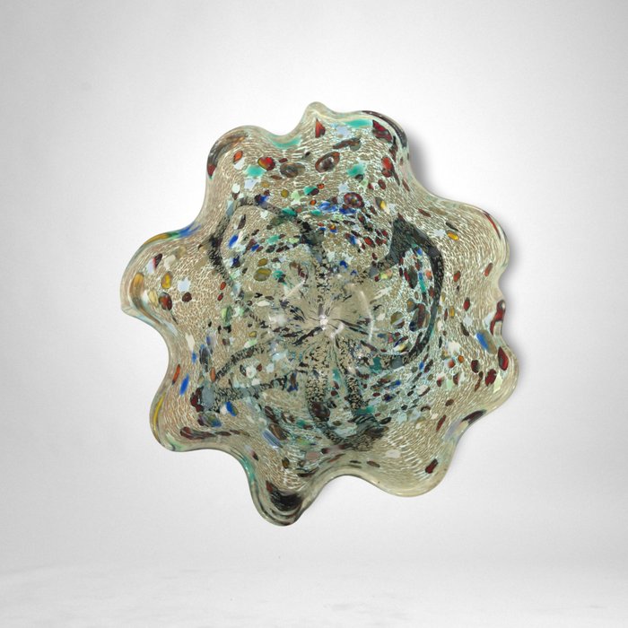 Geblazen vaas handgemaakt door meesters van Murano geïnspireerd door de schilderijen van KANDINSKY een van de grootste kunstenaars aller tijden. De versiering van het stuk werd gedaan met bladgoud dat de meester in het warmgekleurde glas verwerkte, samen met kleine stukjes glas en murrine en zwarte draden.