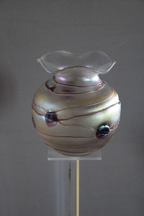 Mooie vaas gemaakt van opaline glas waarbij de buitenkant zo ge-etst is dat het een gouden paarse schijn heeft. Typisch WMF toch heb ik deze vaas niet terug kunnen vinden. Gemaakt in de jaren 1920-1930. Er zijn meerdere stukken uit deze serie bekend. Nog een kleinere vaas en schaal.