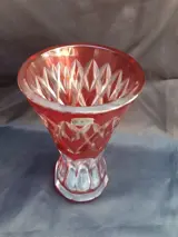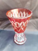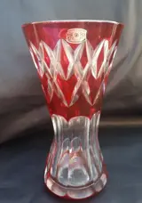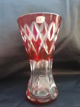 Val Saint Lambert vaas in dik geslepen kristal, Art Deco-periode, kersenrood, diabolo-model. Handtekening op de onderkant en de sticker nog aanwezig.