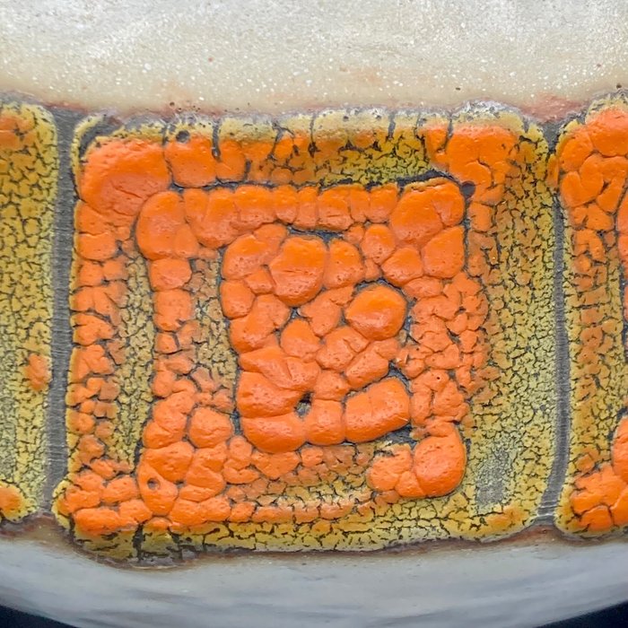 Ter veiling aangeboden is een zeer zeldzame retro keramische kom uit het midden van de eeuw van de Hongaarse keramist Ildikó Várdeák (1929 - 2013). Speelse, dimensionale kleuren sieren dit enorme eierschaalglazuur dat typisch is voor de jaren 60.