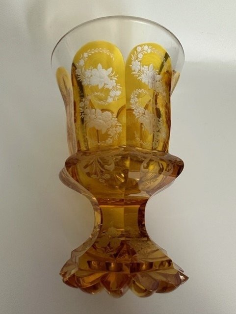 Een zeer mooie vaas uit de vorige eeuw. Vaas op poot in de vorm van een bloem. Zeer mooi handgeslepen glas. Antieke transparante kristallen vaas met floraal ornament.