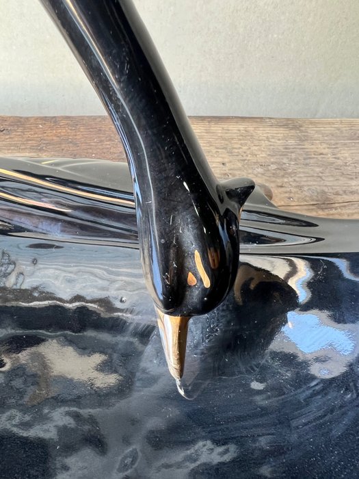 Groot keramisch object geproduceerd in Italië in de jaren 60. Het stelt twee zwarte zwanen voor waarvan de nek elkaar kruist. Het kan worden gebruikt als een zak leegmaken.