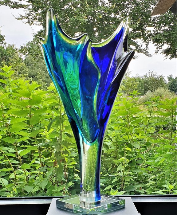 Een mooi glasobject dat is uitgevoerd in een tweetal schitterende kleuren blauw. Het glazen object staat op een transparant glazen sokkel.