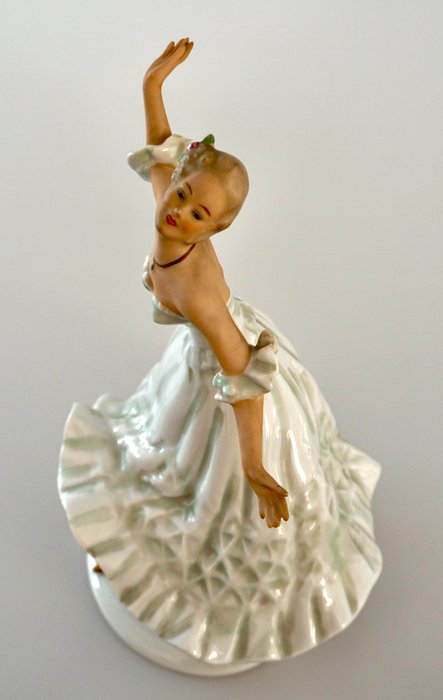 Art Deco porseleinen beeldje van dansende ballerina door Wallendorfer Porzellan Manufaktur uit Duitsland. Beeldje bewaard in perfecte staat, geen scheuren, geen deuken, geen chips, geen reparaties, geen haarlijnen. Het lichaam van de ballerina is gemaakt van mat geglazuurd porselein op een witte glanzende basis en de baljurk en de balschoenen zijn gemaakt van glanzend geglazuurd porselein.
