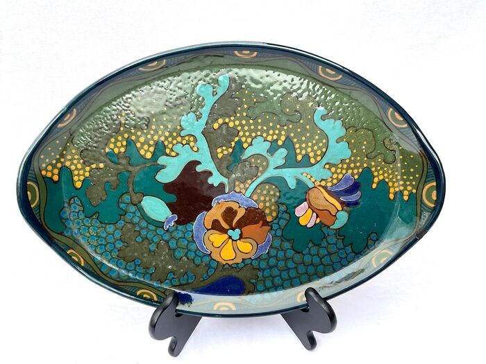 Dit mooie dienblad is gemaakt bij plateelbakkerij Arnhem. De afmetingen zijn 38 x 26 cm. Hij is gedecoreerd met een handgeschilderd decor Polo. De ontwerper van dit decor is Willem Hartgring die eerder bij plateelbakkerij Zuid Holland werkte. Dit decor Polo is de Arnhemse versie van decor Corona van plateelbakkerij Zuid Holland. Dit item is in een uitstekende maar heeft wel een bijgewerkt plekje op de bovenrand (laatste foto ) verder geen chips, scheuren of reparaties.