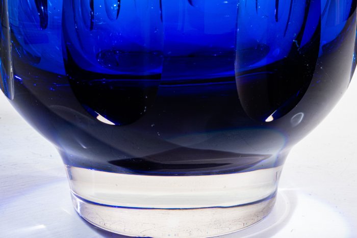 Evenwichtige vorm met een klein voetstuk. Laag in koningsblauwtinten, gevat in helder transparant glas. Drie rijen handgeslepen elliptische lenzen. Gepolijste voet van helder transparant glas. Prachtig kleurenspel en prachtige optische effecten - vooral met een passende verlichting.