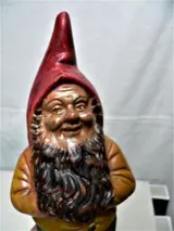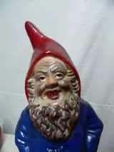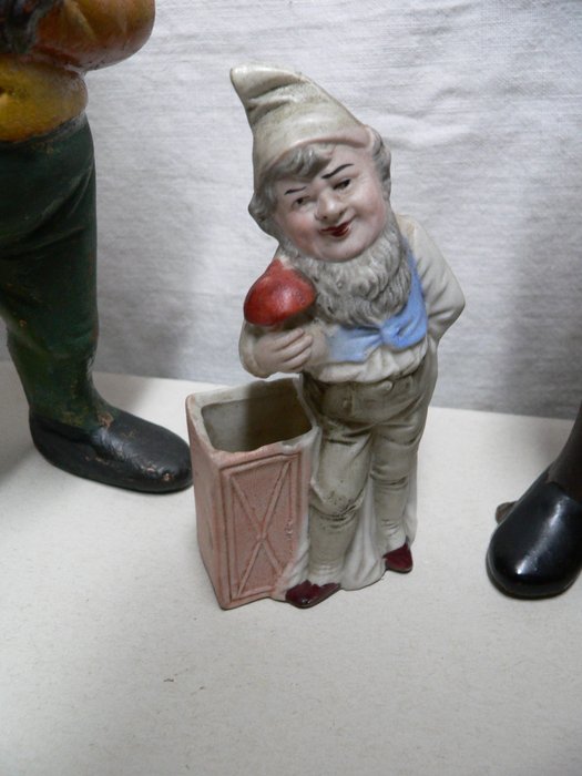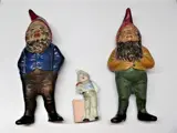 3 kabouters, keramische kabouters geproduceerd rond 1920 en 1900. De grote kabouters zijn 25,5 cm hoog, L= 9,5 cm, B=6,5 cm.De kleine kabouter is van porselein en is 11 cm hoog, 5,5 cm lang en 2,5 cm breed. Er zijn gebruikssporen passend bij de leeftijd.