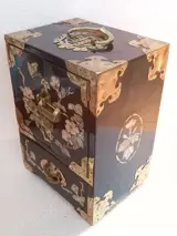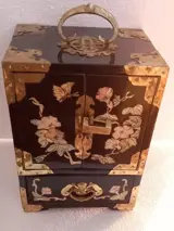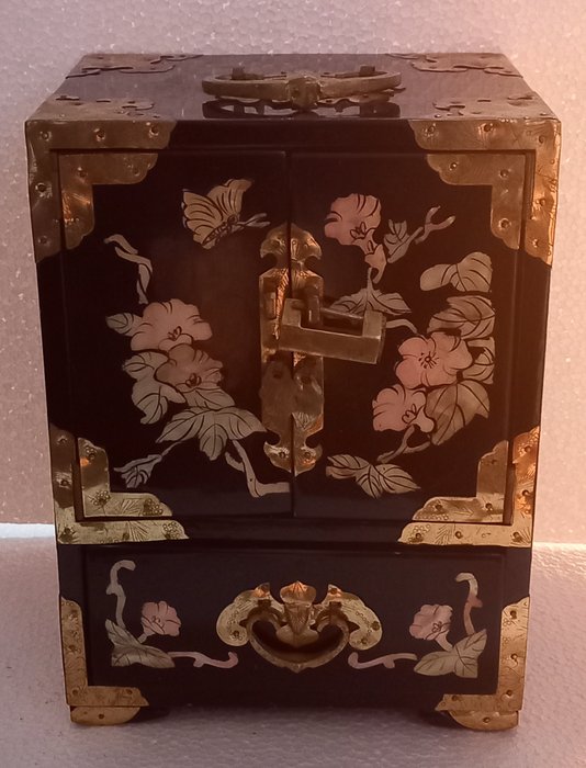 Chinees kunstkabinet geproduceerd in de jaren 60 met bloemig parelmoer inlegwerk en applicaties van friezen, messing trekstangen en handgrepen. Uitgerust met een externe lade met uitschuifbare bodem en drie interne lades, allemaal bekleed met rode bloemenprint zijden stof. Hangslot aanwezig, sleutel ontbreekt.