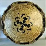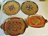 4 Florentijnse Dienbladen. De set van 4 dienbladen van 2 H / 35 / 35, 2 H / 33 / 33 cm, 2 H / 29 / 44 cm, 2 H / 22 / 35,5 cm in zeer goede staat voor de leeftijd.alleen de ronde van 33x33 had een klein schot zonder zwaartekracht, een blikje goudkleur en we kunnen niets zien.