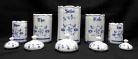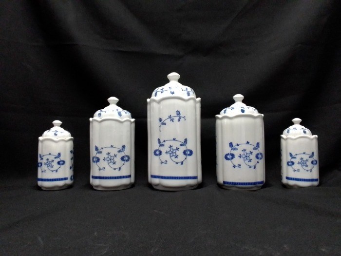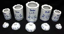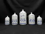 5 porcelein voorraadpotten, 3 maten, wit met blauw bloemmotief, NST