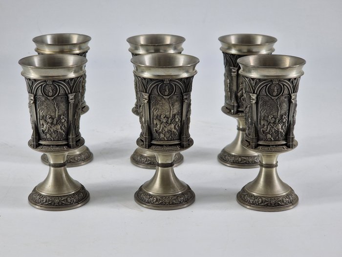 6 prachtige, uiterst gedetailleerde bekertjes van Zinn Galerie -van de ontwerper Albrecht Dürer, gesigneerd aan de onderkant.