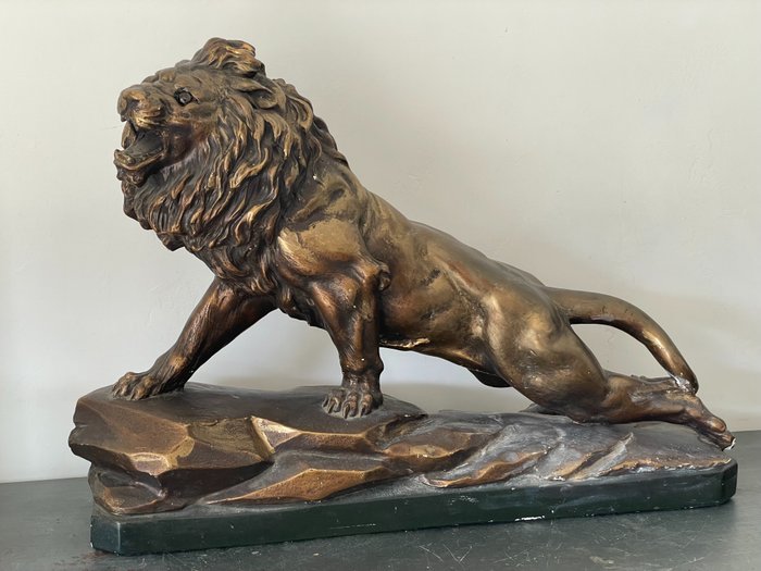 Schitterend beeld, groot beeld van een brullende leeuw in gouden patina, prachtig werk op de details van het lichaam en de manen; In echt goede staat, lichte kleurpuntjes hier en daar. Gesigneerd 645 Frankrijk