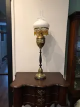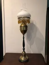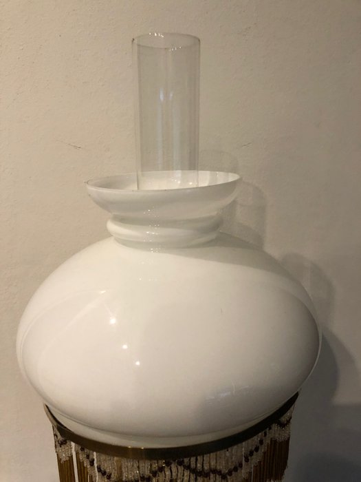 Een prachtige, grote imposante olielamp met ronde houten voet met messing voetstuk met sierelementen, een zwarte houten poot, een ruime messing bak, een schijf waar de kralen aan hangen en die de lampenkap steun is, en de glazen schouw