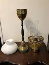 Materiaal: opalina glas (melkwit glas), hout, messing