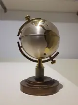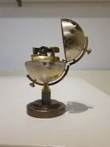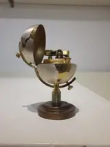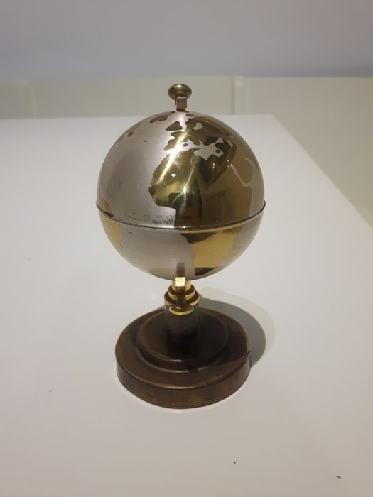 Bureauaansteker, een elegante globe in vermessingd en gedecoreerd staal, met een zware metalen voet, 10 cm hoog, jaren 60. Compleet, geen breuken of deuken maar wel wat kleine ouderdoms- en gebruikssporen. In werkende staat, steen aanwezig, gas moet worden opgeladen.