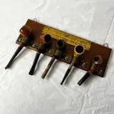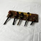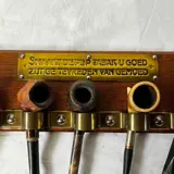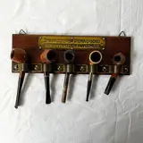 Antiek Eiken houten pijpenrekje met koperen plaatje en ophangbeugel met 5 diverse pijpen.