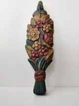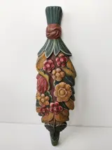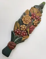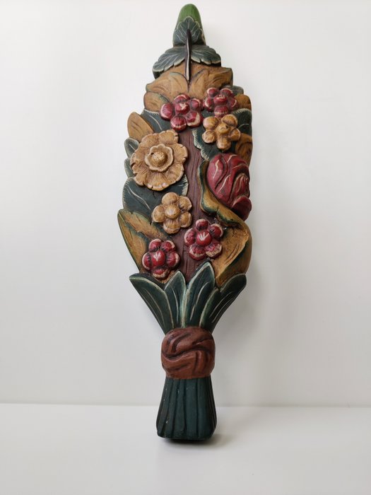 Bijzonder houtsnijwerk. Het ornament is uit één stuk out vervaardigd en beschilderd in destijds waarschijnlijk felle tinten. Nog steeds een prachtig en decoratief stuk in een woning.