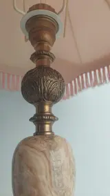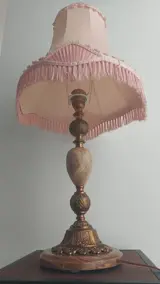 Prachtige antieke elegante koperen tafellamp afgewerkt met een marmeren bol en roze kap. sfeervolle lichtverspreiding.