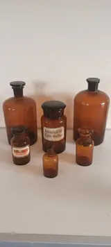 Collectie van 6 bruin glas apothekerspotten waarvan enkele voorzien zijn van origineel opschrift van medicijn. De hoogte is aflopend van 30 cm. naar 14 cm.