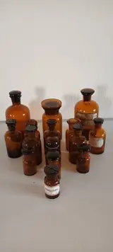 Collectie van 15 bruin glas apothekerspotten/flesjes. De hoogte is aflopend van 17 cm. naar 8 cm.
