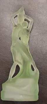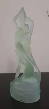 Suggestieve sculptuur van een dansend echtpaar, in geperst satijnglas in groenblauwe kleur. Europa, XX sec. - Binnenin de basis heeft serienummer en geschreven "BREVET". Uitstekende staat; De foto's maken de beschrijving compleet.