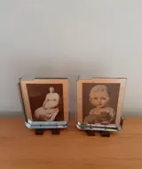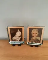 Deze unieke fotokaders gemaakt uit verchroomd staal, hout en spiegelglas in typische bauhaus stijl zijn in gebruikte staat met gebruikerssporen zoals chips aan het glas en enkele krassen in het glas, niets storend vind ik zo kan men de chips niet zien wanneer het glas in de fotokader zit.