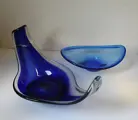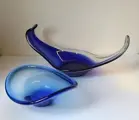 Twee glazen objecten van blank glas met blauwe en donkerblauwe accenten.