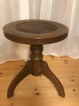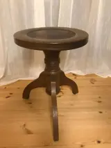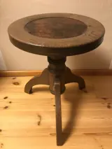 Deze oude, zeer verstelbare pianokruk met ronde zitting en leren inzetstuk is waarschijnlijk gemaakt tussen 1930 en 1950. Het werd vervaardigd door K. Scheffel Fabrikation mod. School- en kantoormateriaal Bruchsal made in Germany.