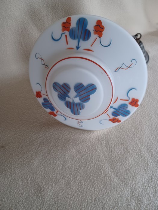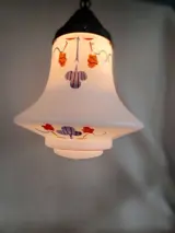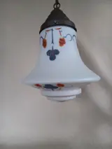 Prachtige Art Nouveau Hanglamp met melkglazen en sierlijke motieven.