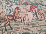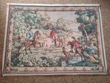 Hallo, ik verkoop een Aubusson Robert Four wandtapijt in goede staat. Het heet "De Jacht". Het werd geproduceerd in Aubusson rond de jaren 70. Het is een handgemaakt wollen tapijt met hartjesprint.