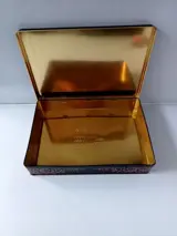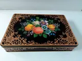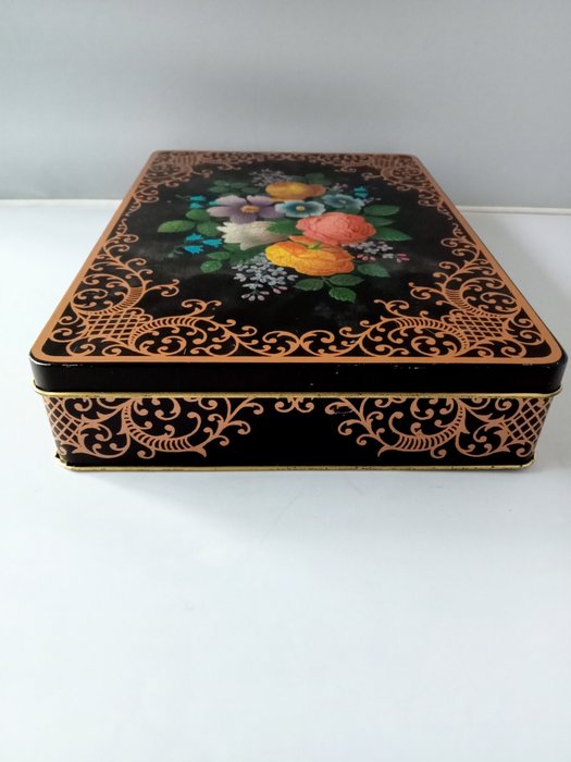 Vintage Barringer Wallis en Manners Metal met een vleugje messing gemaakt in Engeland met scharnierend deksel in zwart met gouden accenten en bloemenboeket in het midden. In vintage staatmet geringe teken van slijtage.