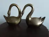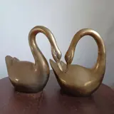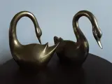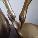 Twee prachtige messing zwanen in paar houding. Het vrouwtje heeft de nek in nederige naar achteren gebogen houding, terwijl het mannetje een machtige naar voren uitstralende houding heeft. Beide zwanen zijn van een zware kwaliteit en wegen meer dan 1000 gram per stuk. De zwanen hebben geen deuken en zijn in goede staat. Ook de hoofden van de zwanen zijn gedetailleerd, met mooie ogen. Foto's maken deel uit van de beschrijving.Uiteraard worden ze goed verpakt verzonden.