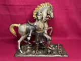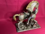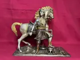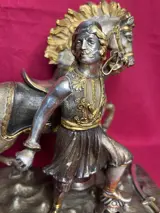 Spectaculair oud beeld in verzilverd brons en puur goud, fijn bewerkt met burijn, voorstellende een Saraceense krijger met zijn paard, de details van het pantser zijn ook mooi, hoofdstellen aanwezig.