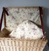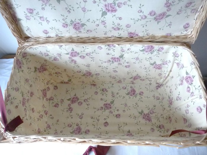 Aangeboden een picknickmand die aan de binnenkant bekleed is in de stof waar ook een picknickkleed van gemaakt is.