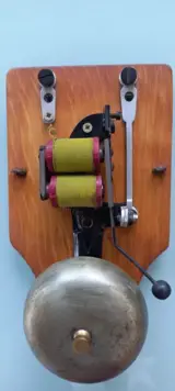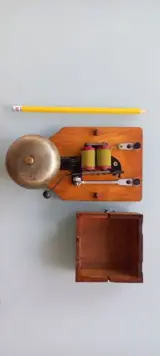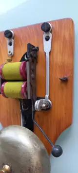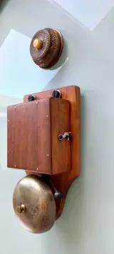 De deurbel is gemonteerd op een houten steun, het elektrische spoelsysteem is in goede staat zonder garantie op werking.