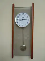 Bell's Quartz wandklok met slinger in perfecte staat, gemaakt van houten drager, metalen rooster en kunststof of stijve slinger.