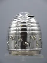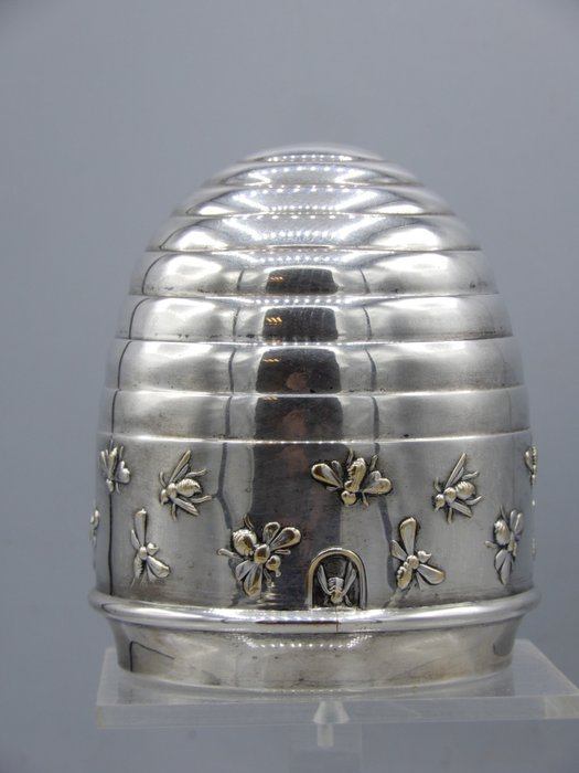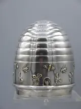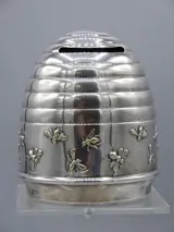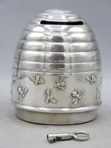 Een charmante spaarpot van verzilverd messing in de vorm van een bijenkorf met veel bijen die het middengedeelte omringen, met werkend slot en sleutel. Geschatte leeftijd: ca. 1930-1950. Aan de onderzijde gestempeld met het merkteken van de maker en het merkteken van de Deense vereniging van fabrikanten.