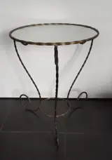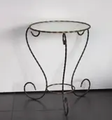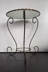 een brocante bijzettafeltje met ijzeren frame in 2 kleuren en een rond glasplaatje erop. Op een klein schilfertje na in perfecte staat, zie foto's.