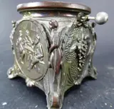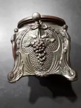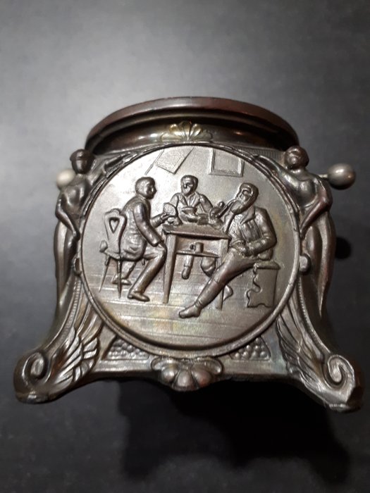 Vintage tinnen asbak met kantelsysteem wat van koper is gemaakt. De asbak is aan 4 zijden fraai bewerkt, 2 zijden met een druiventros, 1 zijde met een drinkgelag en een zijde is floraal versierd. Op de hoeken worden menselijke figuren weergegeven. Het kantelsysteem is rond. Zie voor verdere