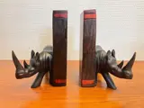 De boekenhouder met neushoorns zijn gemaakt met prachtig houtsnijwerk.