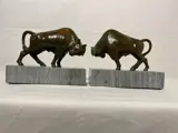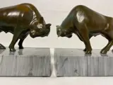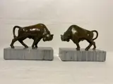 Paar art deco gestileerde stier boekensteunen op een Carrara marmeren sokkel.