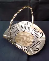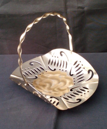 Het mandje bestaat uit een ronde plaat blik die links en rechts is omgevouwen en waaraan een hengsel is aangebracht.