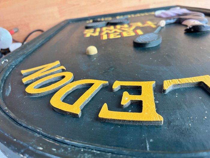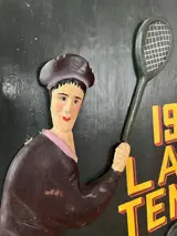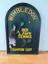 Wimbledon pub bord. De figuur, rackets en de letters Wimbledon staan in 3D op het bord. Opmerkelijk is dat het een bord is dat de vrouwelijke tennissers op het toernooi als onderwerp heeft.