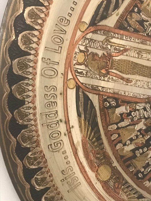 Egyptisch souvenirbord in koperen voet met messing versieringen.