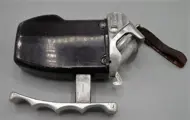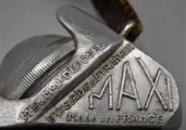 Dit is een vintage franse dynamo zaklamp gemaakt van aluminium en dateert uit de jaren 1920-1930. Gestempeld boven maxi, gemaakt in frankrijk, bte sgdg & etranger, mle & mque depose, (een zijde) bretton cluses hte savoie (aan de andere kant). Deze zaklamp is 11 cm hoog, 6,5 cm breed aan de zijkant, 2,8 cm dik. Aan de bovenkant is een kleine leren ring bevestigd. Voorzijde is een kleine wit glazen reflector. De dynamo wordt opgeladen door de voorgreep die ingedrukt wordt en loslaat om de zaklamp op te laden. Er is een kleine klem die de dynamo-sectie vasthoudt wanneer deze zaklamp wordt opgeladen die goed houdt. Dit is een ongebruikelijke zaklamp. In goede staat voor de leeftijd geen deuken, dings glass is in goede staatdeze zaklamp werkt goed.